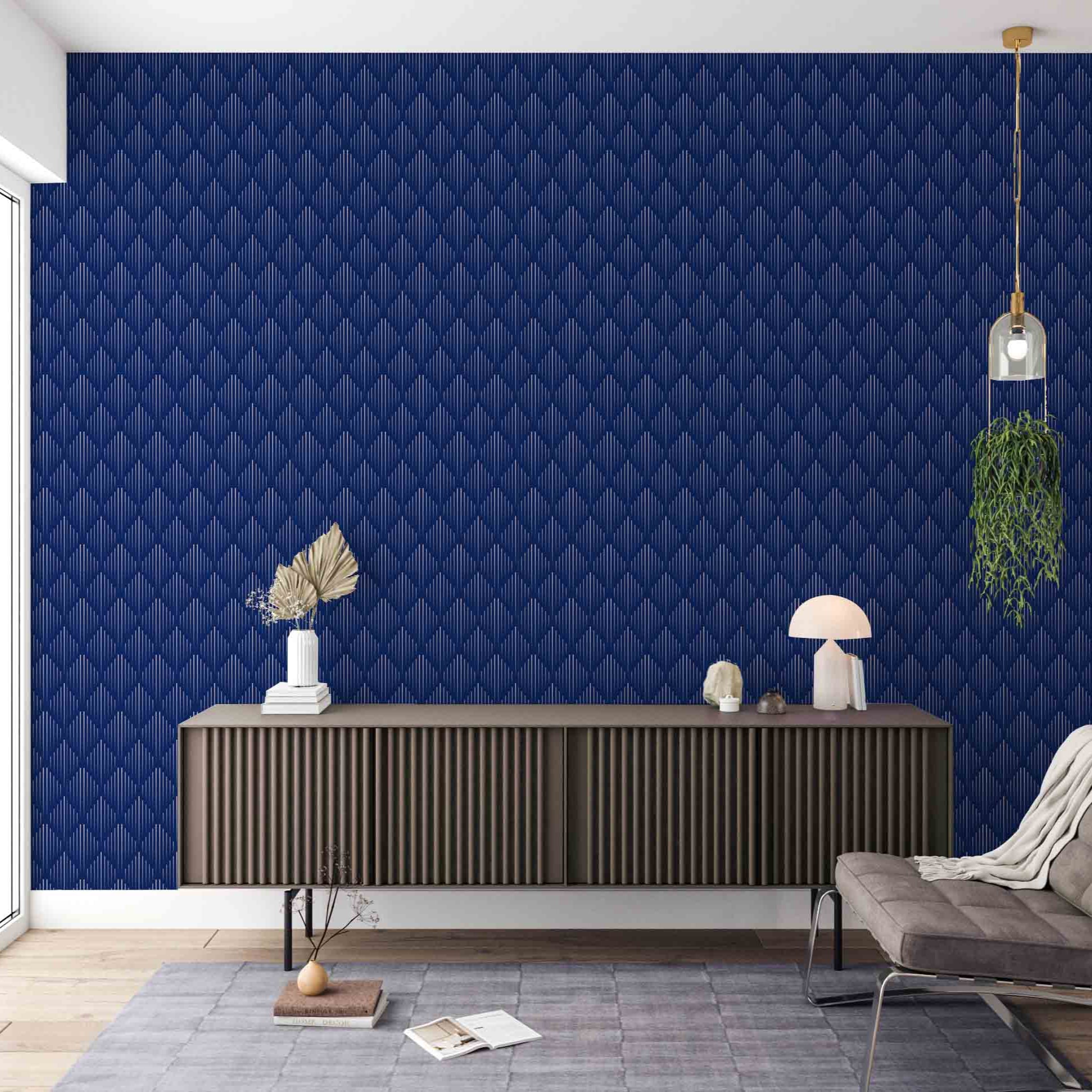 This wallpaper features a minimalist and geometric pattern with vertical stripes arranged in a zigzag pattern. The stripes are white against a navy blue background, creating a classic and timeless look.