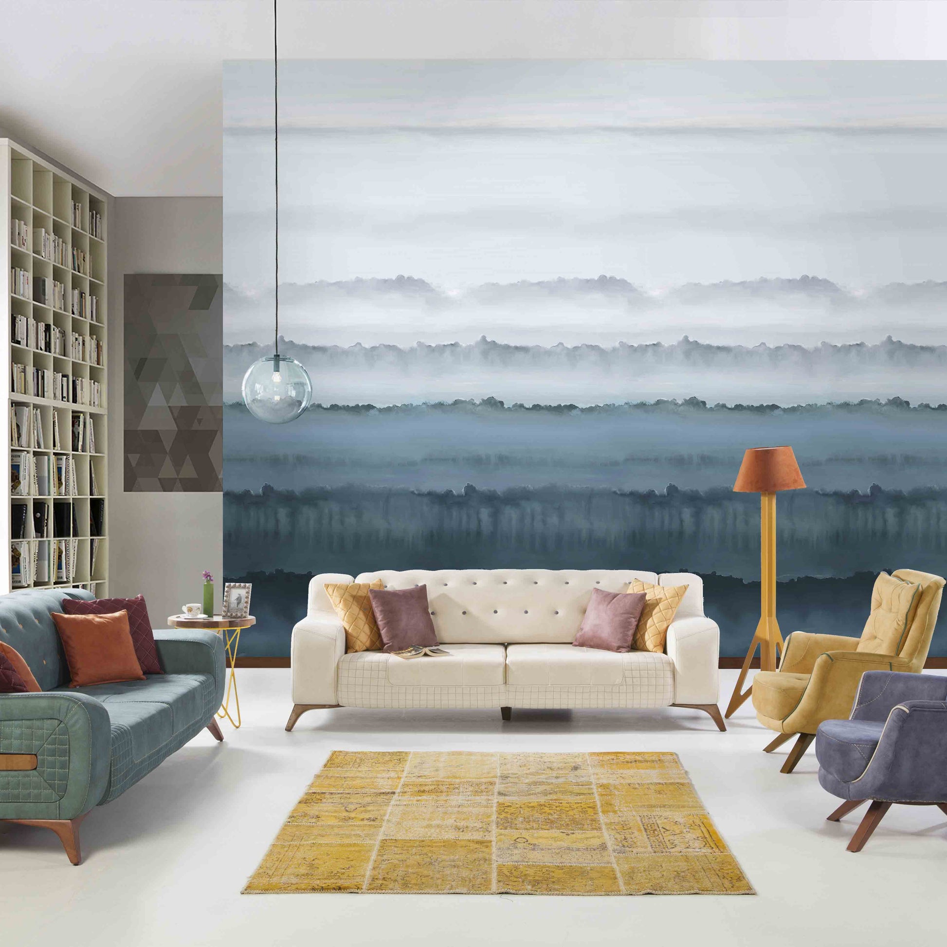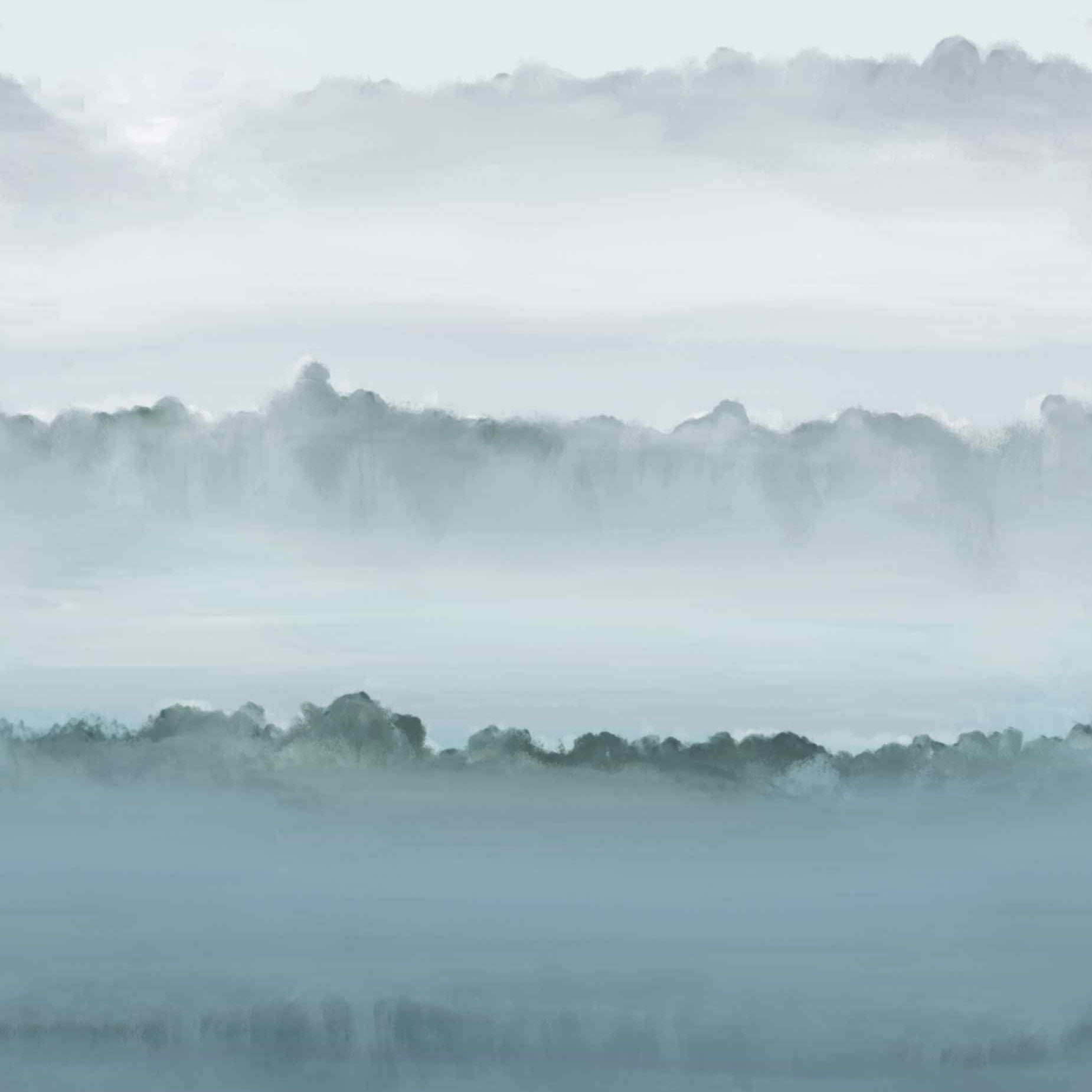 This wallpaper features a horizontal gradient of muted blue tones, from a light gray at the top to a deep teal at the bottom. The colors are soft and blended, creating a tranquil and serene atmosphere. The design resembles rolling hills or waves, evoking a sense of nature and calmness.